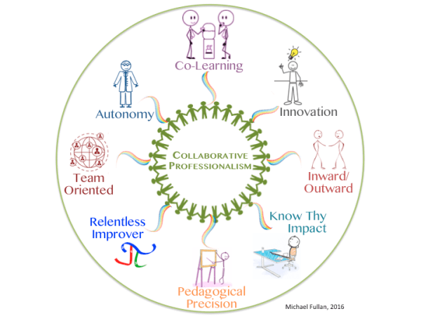 Fullan’s diagram (below) shows the elements of collaborative professionalism that he says interact, feed on each other, and self-correct. They operate like a flywheel— accelerating once on the move.